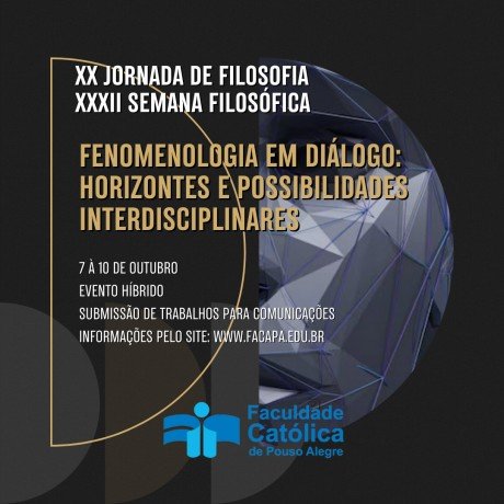 A XX Jornada de Filosofia e XXXII Semana Filosófica do curso de Filosofia da Faculdade Católica de Pouso Alegre tem por tema "Fenomenologia em diálogo: Horizontes e possibilidades interdisciplinares". Para participar como ouvinte ou como comunicador, acesse o link aqui.